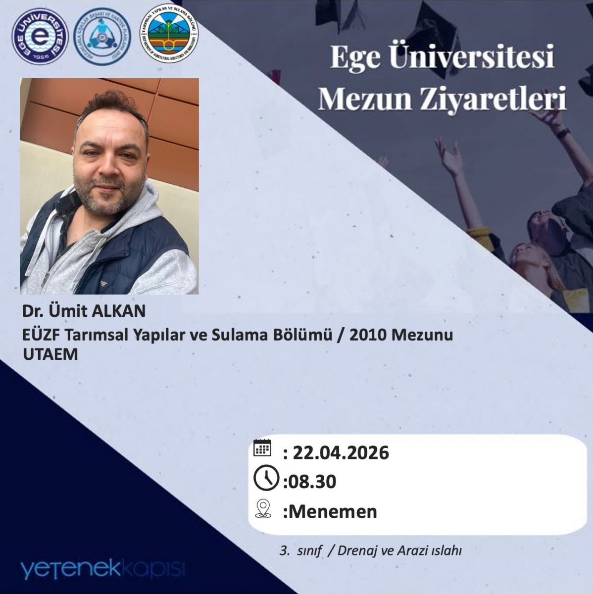 Drenaj ve Arazi Islahı dersi kapsamında gerçekleştirilen Mezun Ziyareti etkinliğinde Dr. Ümit Alkan , drenaj sistemlerinin performans değerlendirmesine yönelik yürütülen çalışmalar hakkında bilgilendirme yapmıştır.